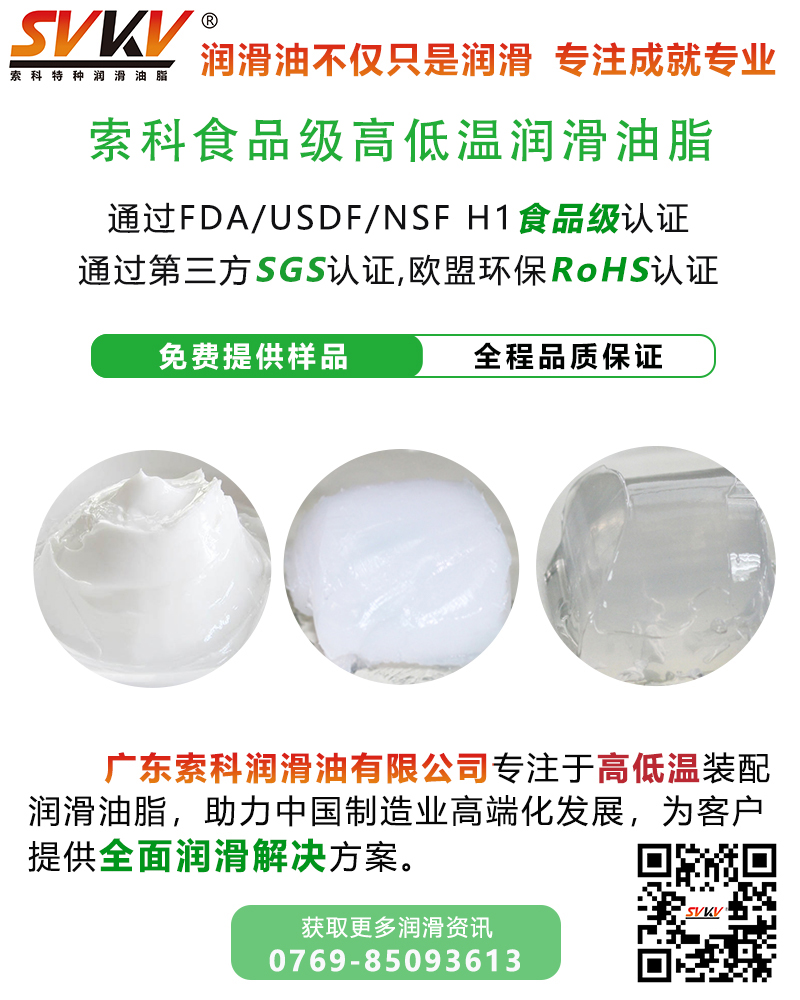 SVKV索科食品級(jí)全合成高低溫消音潤(rùn)滑油脂選用食品級(jí)的基礎(chǔ)油和無(wú)毒無(wú)害的添加劑精制而成,專為食品加工和醫(yī)療設(shè)備而研制。SVKV索科食品級(jí)全合成高低溫靜音潤(rùn)滑脂符合美國(guó)FDA和USDA法規(guī)和標(biāo)準(zhǔn),并通過(guò)美國(guó)USDA/NSF H-1食品級(jí)認(rèn)證,保障烤箱食品安全健康。