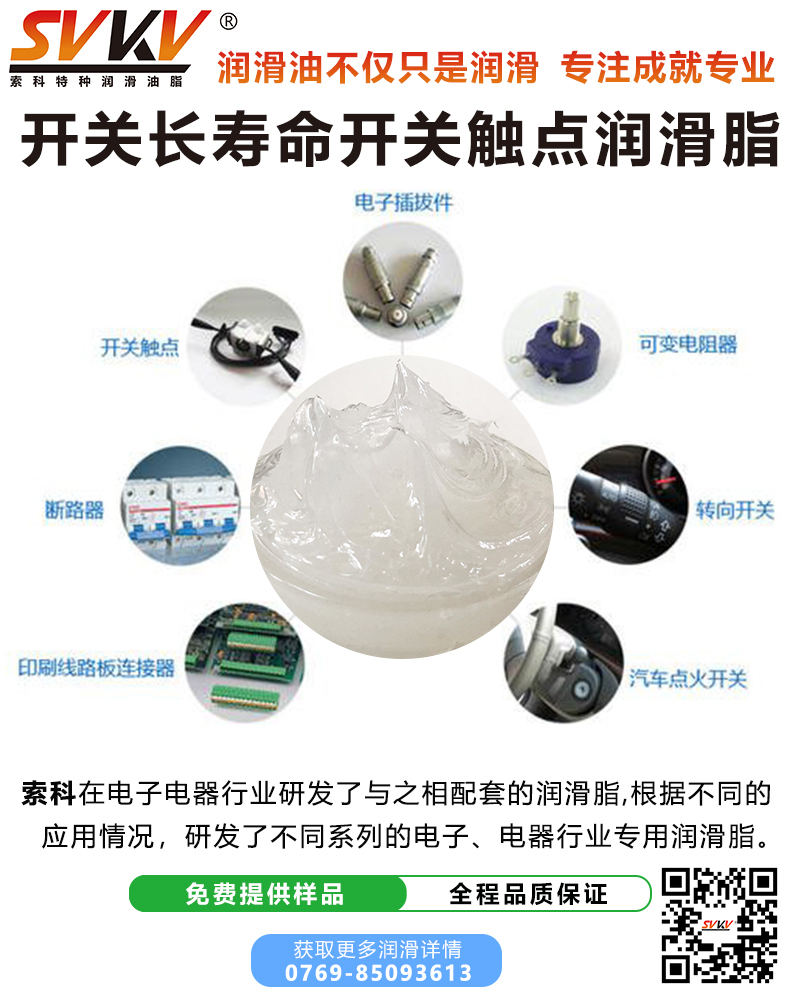 索科SVKV長(zhǎng)壽命開關(guān)觸點(diǎn)潤(rùn)滑脂廣泛用于汽車、家電、玩具等開關(guān),主要有微動(dòng)開關(guān)、柱式開關(guān)、滑動(dòng)開關(guān)、旋轉(zhuǎn)開關(guān)、彈片、觸點(diǎn)、簧壓搖桿開關(guān)或壓按式開關(guān),有效減少電弧和降低磨損的特性使其操作順暢、觸感優(yōu)異且提高開關(guān)導(dǎo)電性能,使用產(chǎn)品壽命更長(zhǎng)。