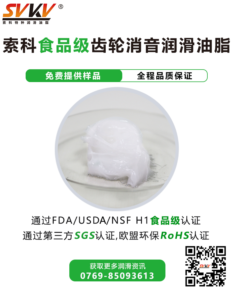 索科SVKV食品級(jí)齒輪消音潤(rùn)滑油脂選用食品級(jí)的基礎(chǔ)油和無(wú)毒無(wú)害的添加劑精制而成,專為食品加工及醫(yī)療設(shè)備而研制。索科SVKV食品級(jí)齒輪消音潤(rùn)滑油脂符合美國(guó)FDA和USDA的法規(guī)和標(biāo)準(zhǔn),并通過美國(guó)NSF H-1食品級(jí)認(rèn)證,確保食品設(shè)備的衛(wèi)生、安全。