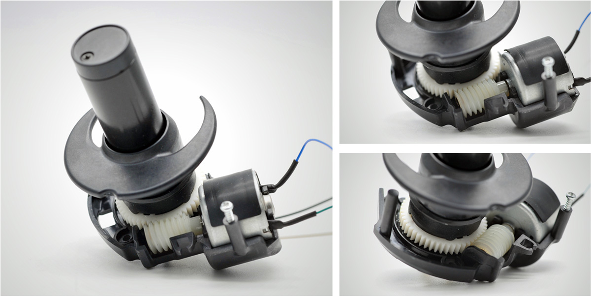 渦輪蝸桿齒輪箱可以有效的自鎖,通過(guò)渦輪蝸桿的螺旋角自鎖設(shè)計(jì)防止頭發(fā)旋轉(zhuǎn)卷曲后達(dá)到一定力矩后旋轉(zhuǎn)機(jī)構(gòu)的回轉(zhuǎn)。